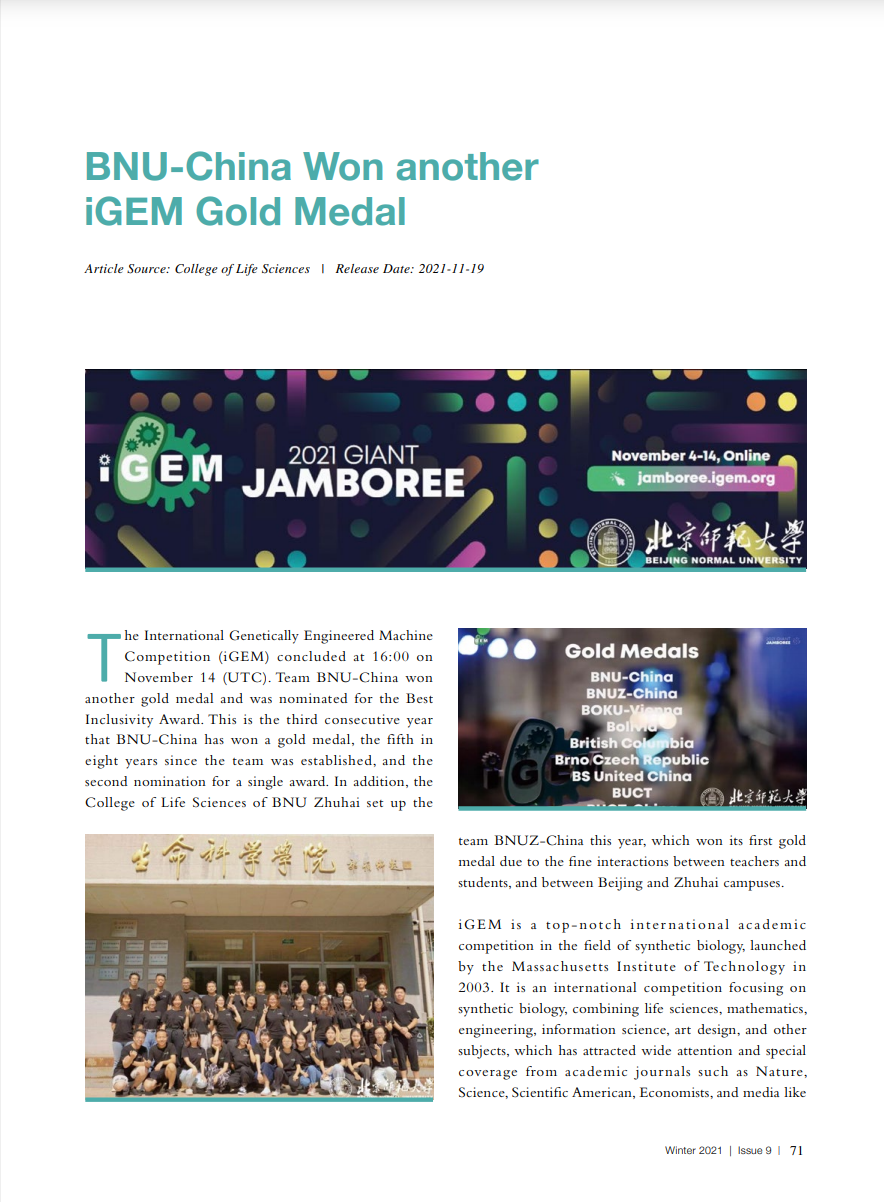 The International Genetically Engineered Machine Competition (iGEM) concluded at 16:00 on November 14 (UTC). Team BNU-China won another gold medal and was nominated for the Best Inclusivity Award…