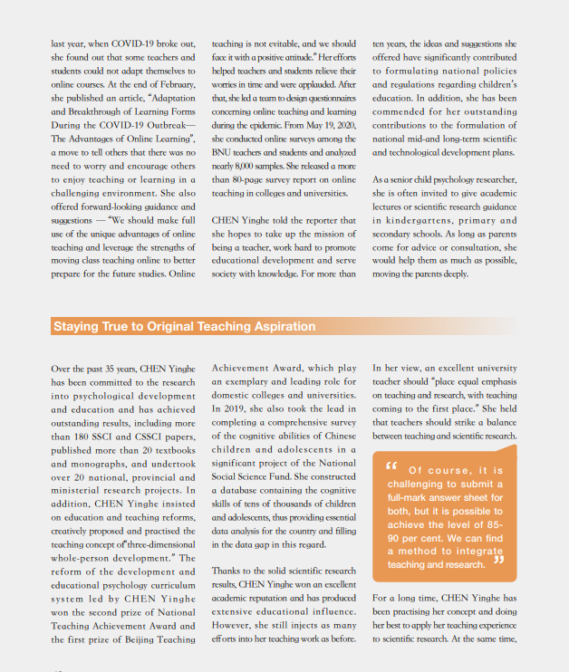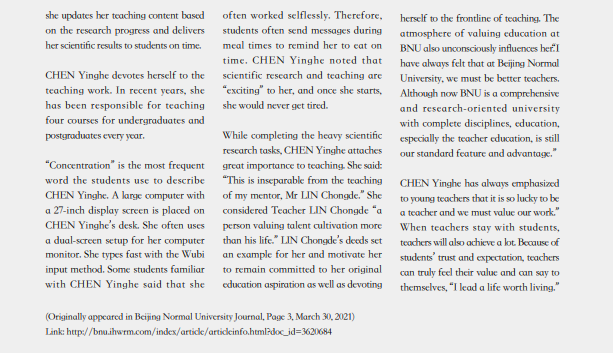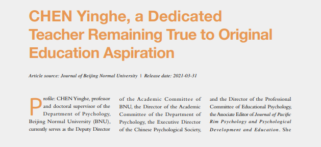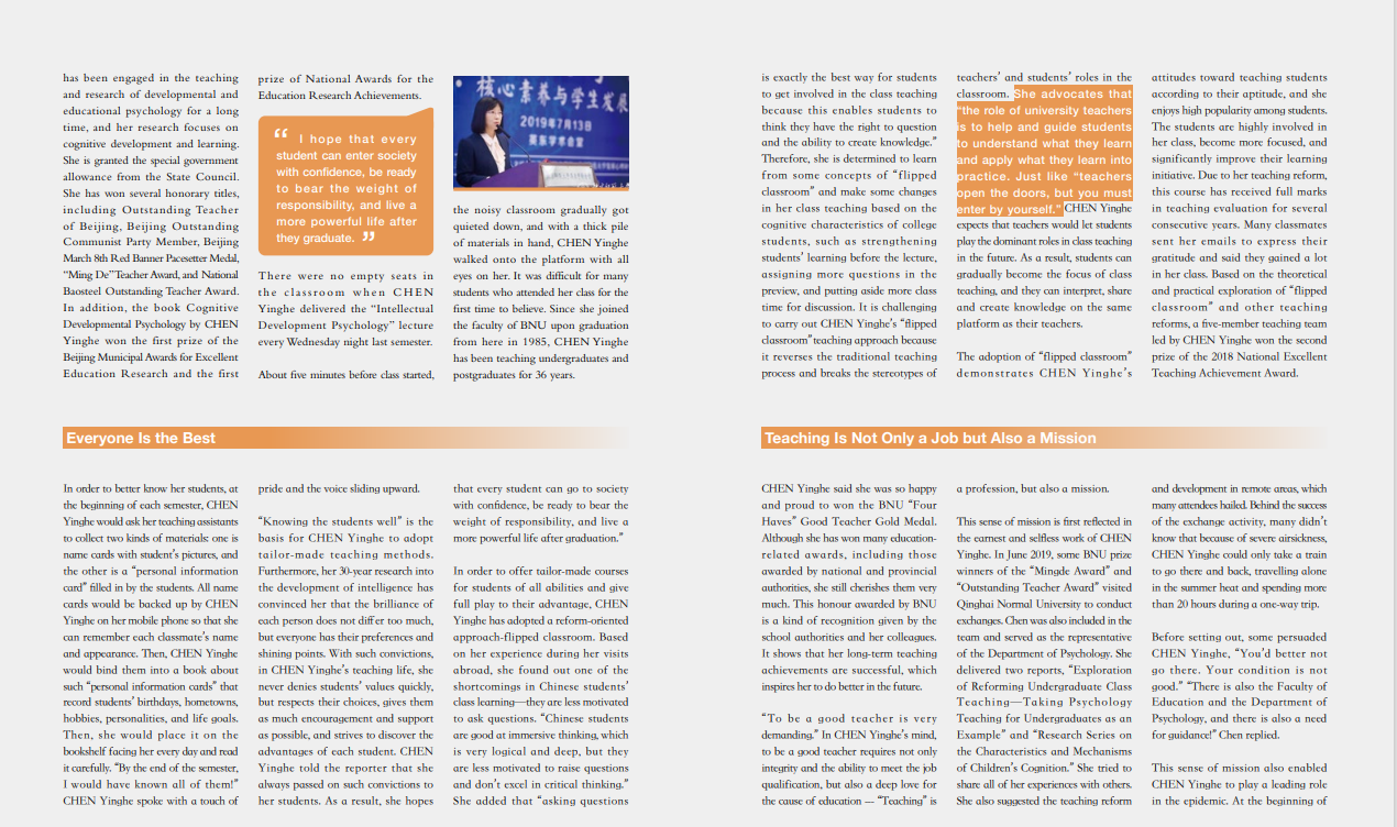CHEN Yinghe, a Dedicated Teacher Remaining True to Original Education Aspiration