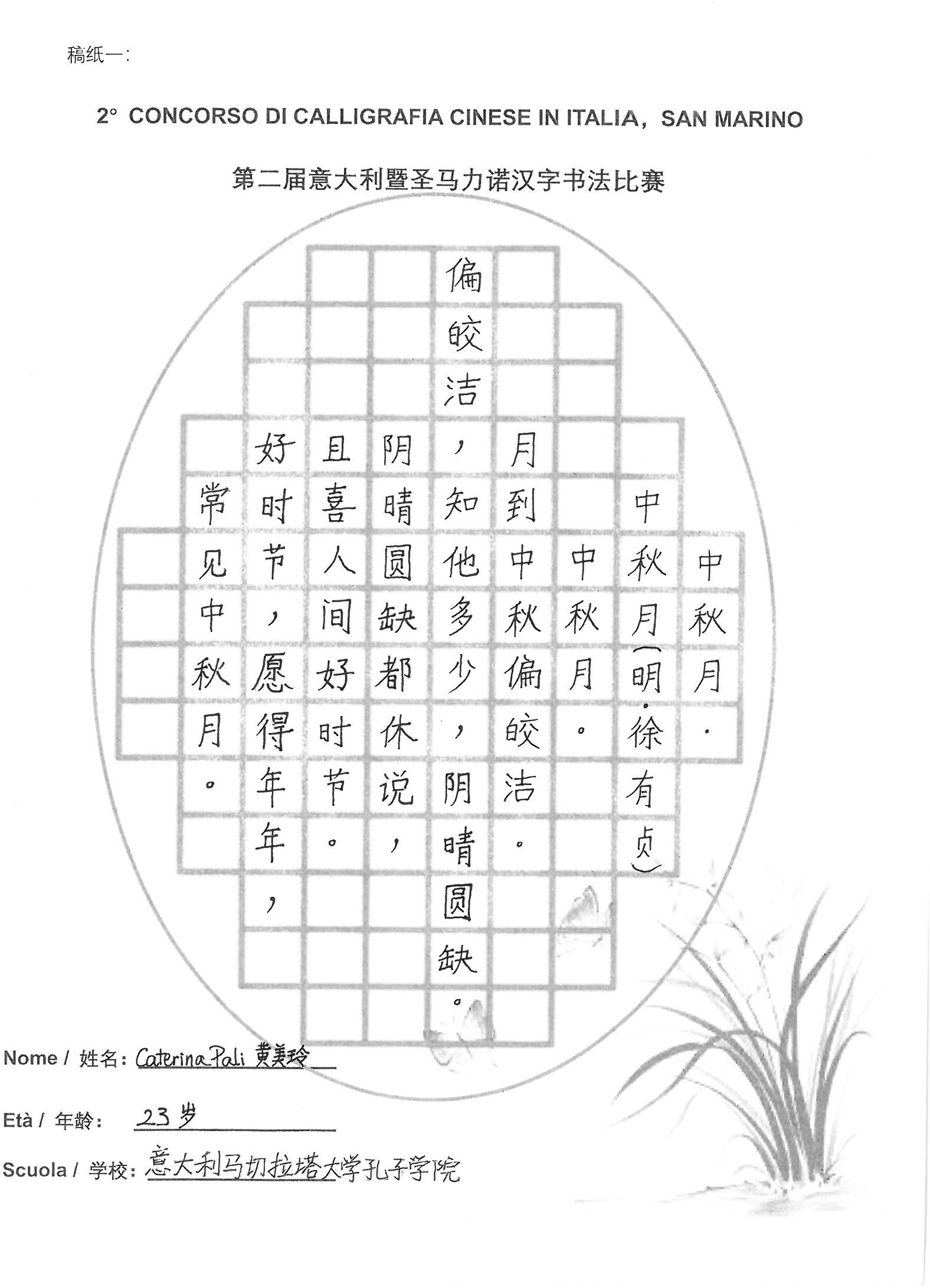 第二届意大利暨圣马力诺“汉字之美”中文书法比赛于11月中旬落下帷幕。马切拉塔大学孔子学院积极参与,选派了六位学生参赛。六位选手于两百多名参赛者中脱颖而出,悉数获奖,其中Valentina Prisca Rossi和Caterina Pali表现优异,双双获得成人组一等奖;Agnese Mancini 和Artone Alessandra获得二等奖;Giancane Elisabetta和Michele Orciani获得三等奖。
