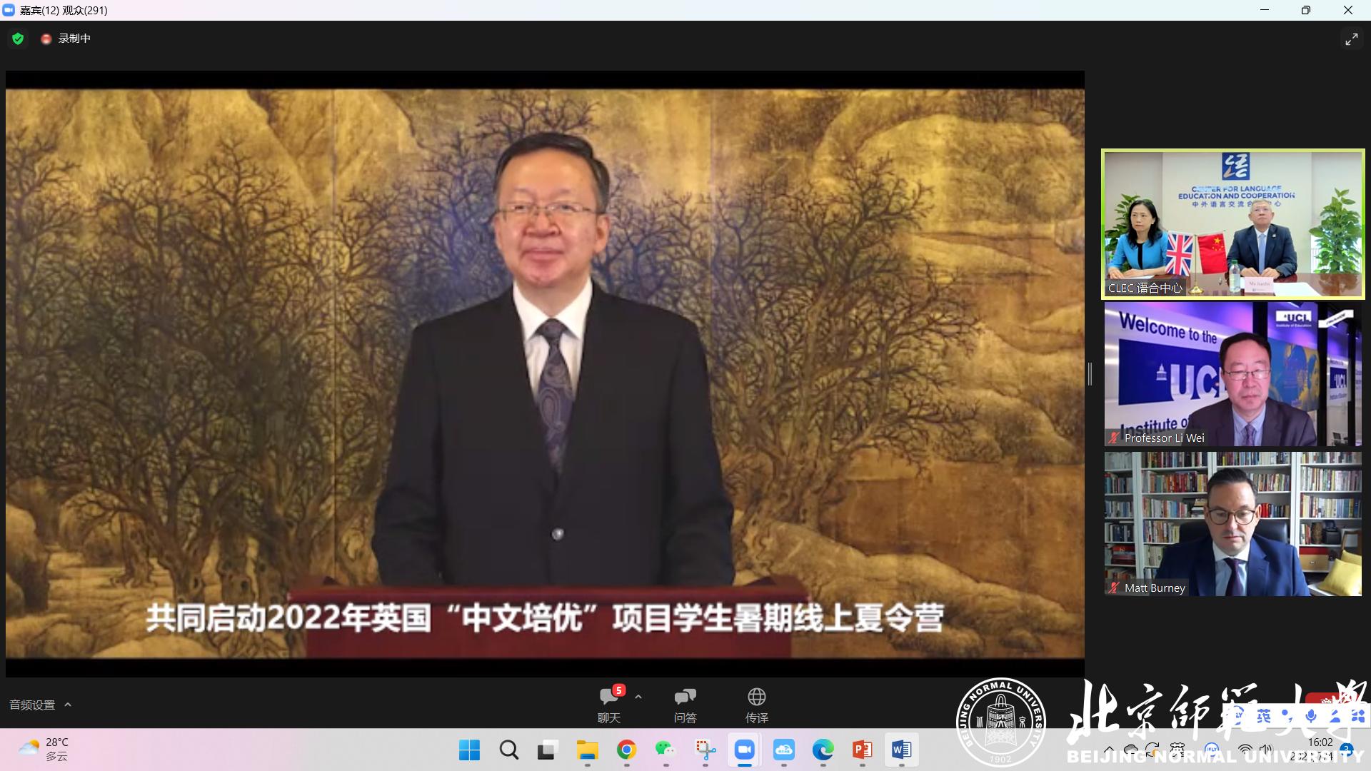 7月4日,2022年“汉语桥”英国“中文培优”项目学生在线夏令营开幕式举行。开幕式由中外语言交流合作中心主任马箭飞主持,中国教育部副部长田学军、英国教育部学校事务部长罗宾·沃克(Robin Walker)、英国驻华使馆文化教育公使/英国文化教育协会中国区主任包迈岫(Matt Burney)、伦敦大学学院教育学院院长李嵬出席并致辞。此外,还有来自英国64所培优学校和16所中国参与机构的近2000名师生一同参加了开幕式。