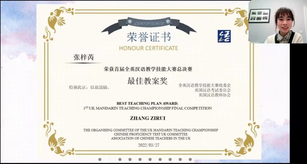 2022年3月27日,由教育部中外语言交流合作中心英国代表处主办的首届“全英汉语教学技能大赛总决赛”在线上成功举行。曼彻斯特大学孔子学院教师志愿者余丹蕖获三等奖,张梓芮获最佳教案奖。